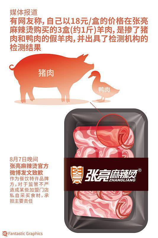 事实上,早在2019年,张亮麻辣烫就有门店被曝光销售混有鸭肉的羊肉卷。根据当时的媒体报道,有消费者反映张亮麻辣烫有门店销售的牛羊肉卷包装上无生产日期、保质期及生产厂址等产品信息,执法人员现场调查追溯肉卷来源时发现,这些“羊肉卷”中的鸭肉含量达60%。对此,张亮麻辣烫表示,公司已责令涉事加盟店停业整顿。