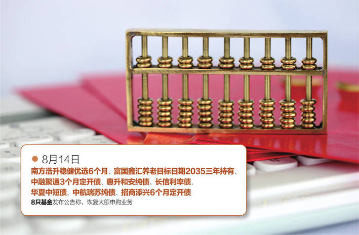 另外,《每日经济新闻》记者发现,8月14日,包括南方浩升稳健优选6个月、富国鑫汇养老目标日期2035三年持有、中融聚通3个月定开债、惠升和安纯债、长信利率债、华夏中短债、中航瑞苏纯债、招商添兴6个月定开债等8只基金发布公告称,恢复大额申购业务。