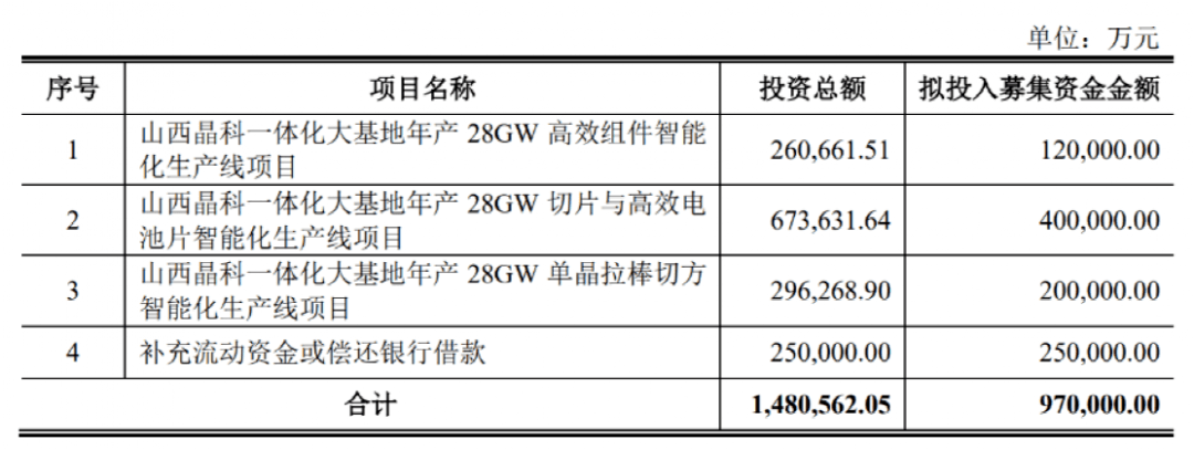 当时的投资项目包括“年产11GW高效电池生产线项目”“晶科光伏制造有限公司年产8GW高自动化光伏组件生产线项目”、“上饶市晶科光伏制造有限公司新倍增一期8GW高自动化组件项目”、“二期20GW拉棒切方项目一阶段10GW工程建设项目”。除此之外,该公司还计划使用30亿元募集资金用于补充流动资金及偿还银行借款。