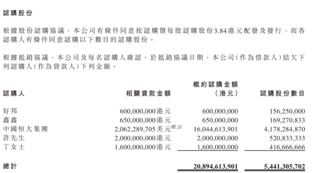 这208亿多港元的贷款都是来自恒大系。贷款转换为新股份后,其中中国恒大集团认购41.78亿股,许家印认购5.2亿股,丁玉梅(许家印妻子)认购4.17亿股,好邦(由丁玉梅全资)拥有认购1.56亿股,鑫鑫(由许家印全资拥有)认购1.69亿股。有关认购金额将根据抵销协议的条款及条件,透过于完成后抵销恒大新能源汽车应付各认购方的相关贷款的方式偿付。