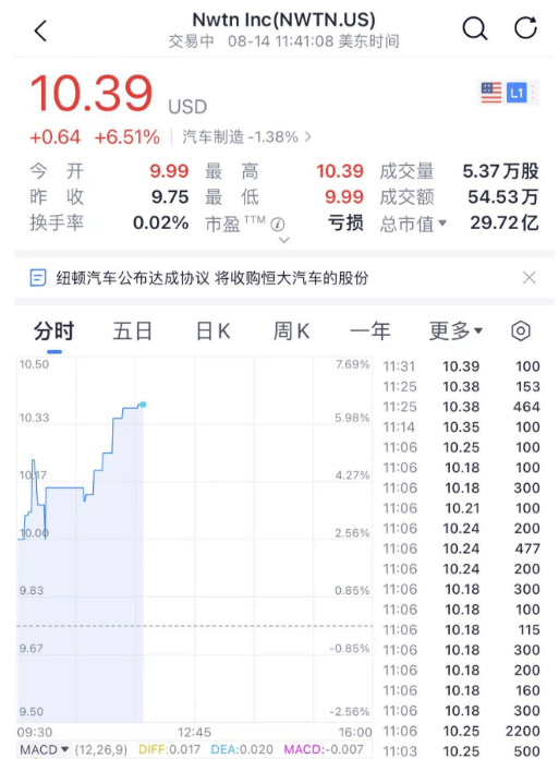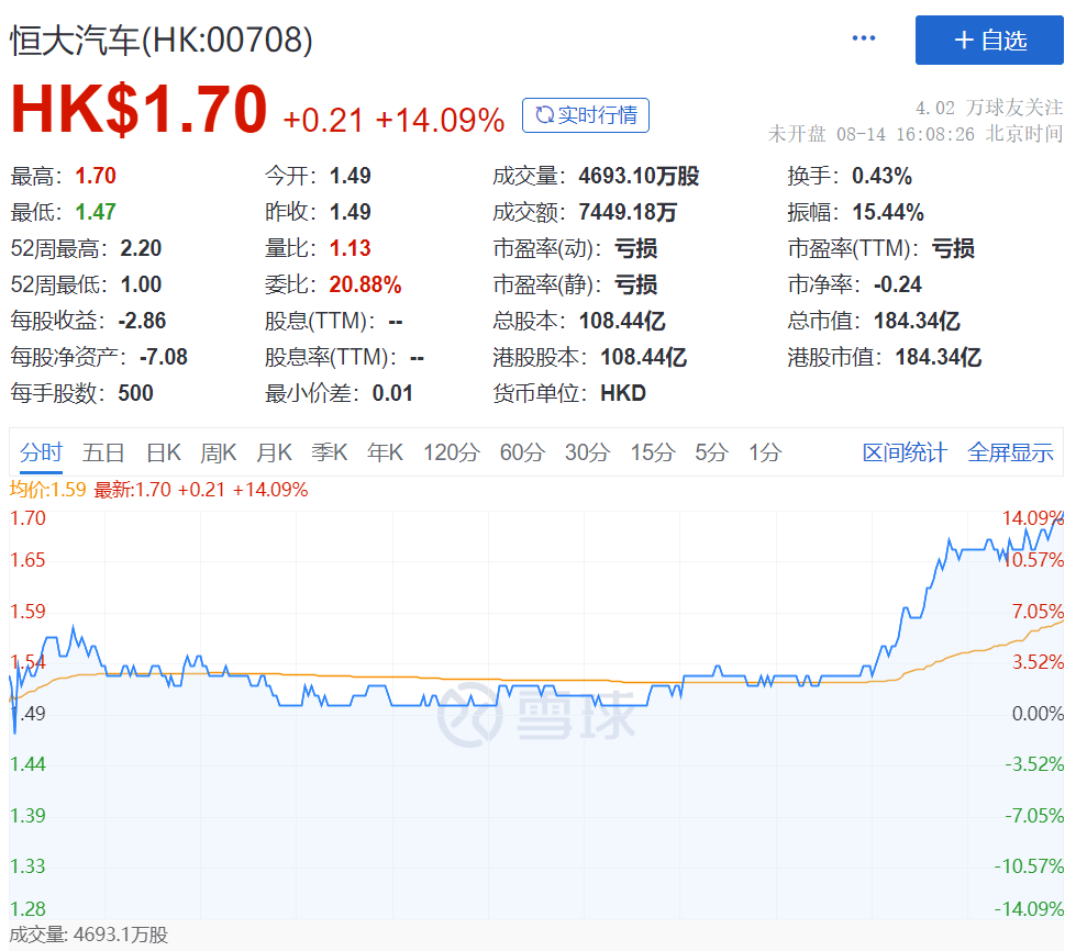 值得注意的是,恒大汽车8月14日尾盘股价异动拉升,收盘大涨14%。