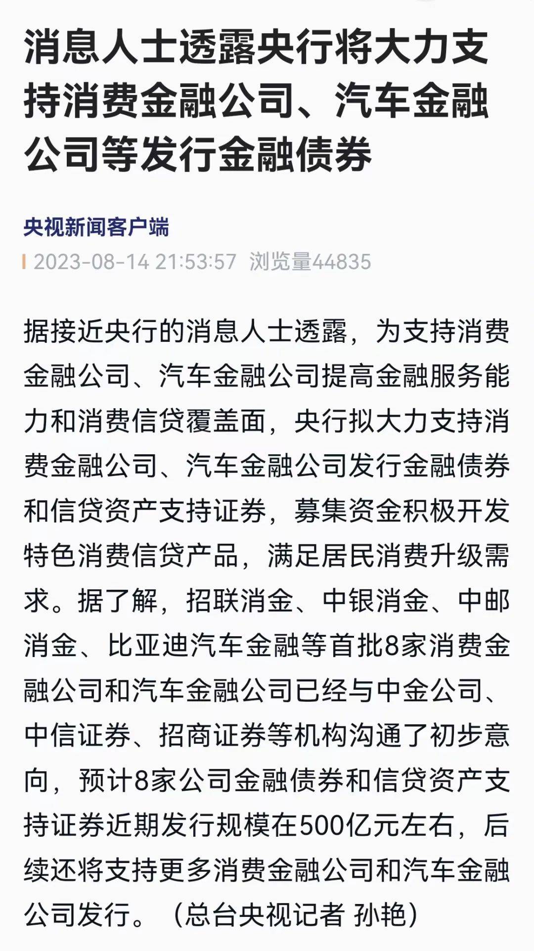央视新闻报道,据接近央行的消息人士透露,为支持消费金融公司、汽车金融公司提高金融服务能力和消费信贷覆盖面,央行拟大力支持消费金融公司、汽车金融公司发行金融债券和信贷资产支持证券,募集资金积极开发特色消费信贷产品,满足居民消费升级需求。据了解,招联消金、中银消金、中邮消金、比亚迪汽车金融等首批8家消费金融公司和汽车金融公司已经与中金公司、中信证券、招商证券等机构沟通了初步意向,预计8家公司金融债券和信贷资产支持证券近期发行规模在500亿元左右,后续还将支持更多消费金融公司和汽车金融公司发行。