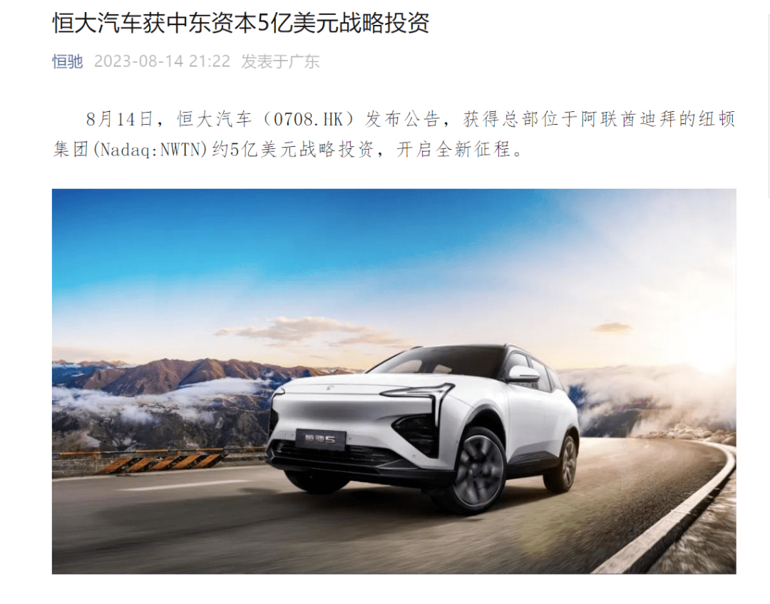 恒大汽车发布公告,获得总部位于阿联酋迪拜的纽顿集团(NWTN集团)约5亿美元战略投资,另有6亿人民币过渡资金将自公告后5个工作日开始陆续到账。所有战投资金全部用于恒大汽车天津工厂,确保恒驰5的正常生产和恒驰6、7的陆续量产。