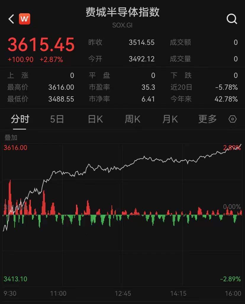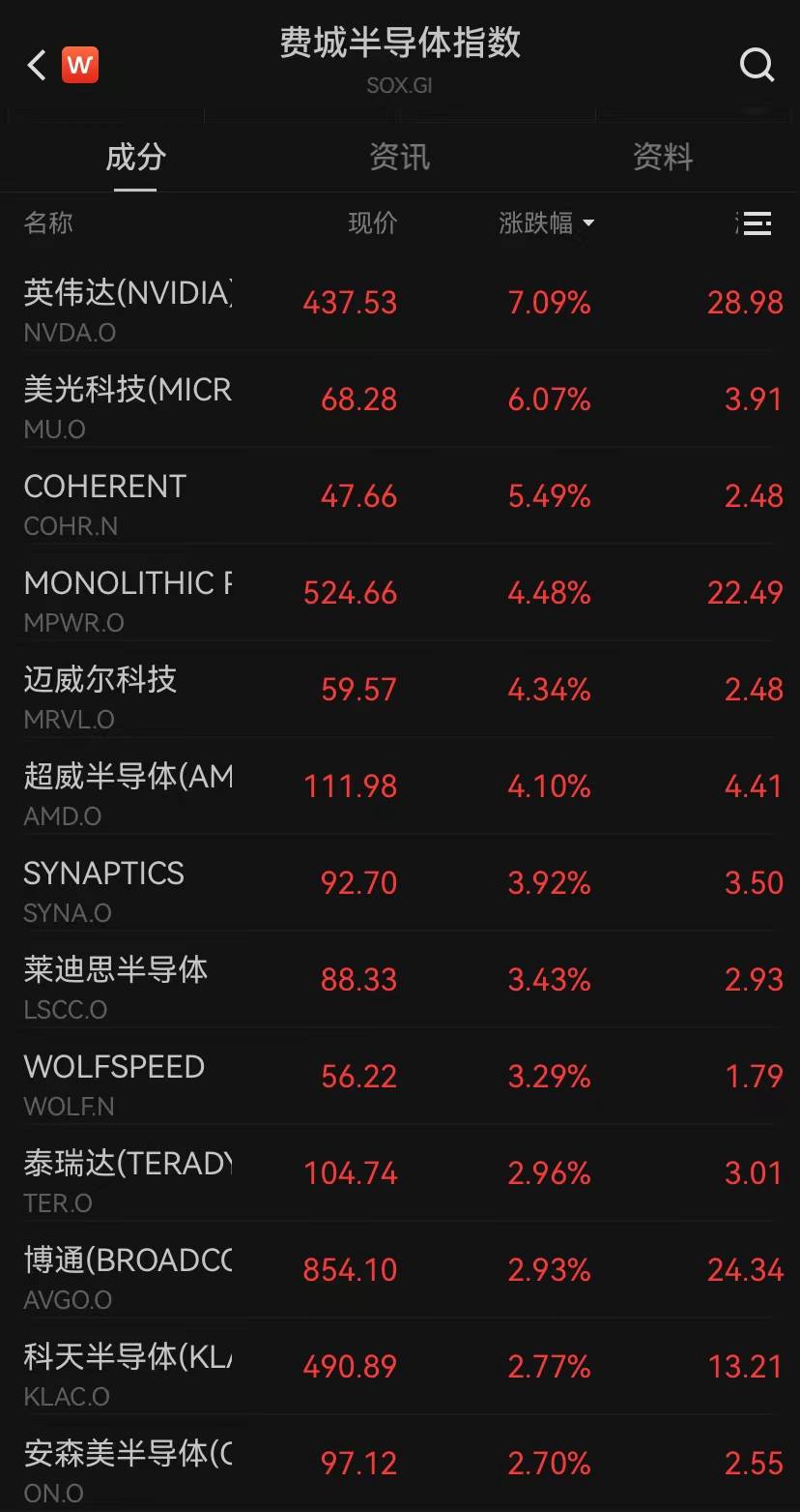 费城半导体指数全日拉升,收盘涨2.87%。英伟达涨7.09%,摩根士丹利周一发布报告称,英伟达仍然是该公司最新收益报告中的“首选”,并对其给出好于预期的预测。美光科技涨超6%,迈威尔科技、超威半导体等涨超4%,博通、安森美半导体、德州仪器等涨超2%。