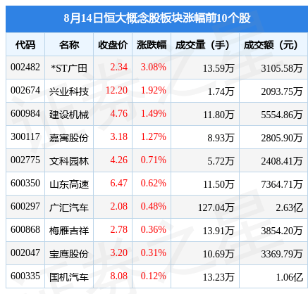 8月14日恒大概念股板块较上一交易日下跌0.33%,经纬纺机领跌。当日上证指数报收于3178.43,下跌0.34%。深证成指报收于10755.14,下跌0.5%。恒大概念股板块个股涨跌见下表: