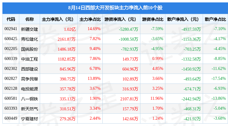 8月14日西部大开发板块较上一交易日上涨0.61%,新疆交建领涨。当日上证指数报收于3178.43,下跌0.34%。深证成指报收于10755.14,下跌0.5%。西部大开发板块个股涨跌见下表: