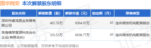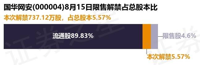 根据市场公开信息整理,国华网安(000004)于8月15日将有737.12万股限售股份解禁上市,为公司定向增发机构配售股份,占公司总股本5.57%。最近一年内,该股累计解禁258.23万股,占总股本的1.95%。本次解禁后,公司还有609.22万股限售股份,占总股本4.6%。具体如下图所示: