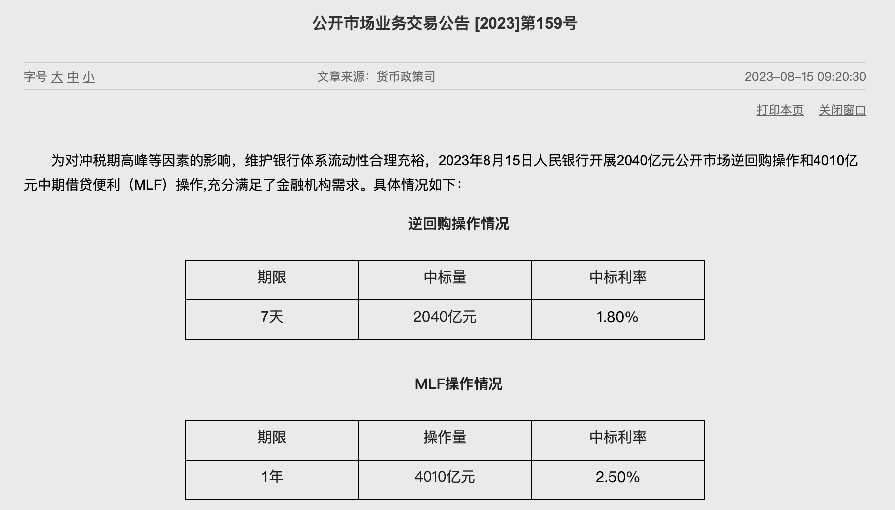 经济观察网讯据央行网站消息,8月15日,央行公开市场开展4010亿元1年期中期借贷便利(MLF)操作和2040亿元7天期逆回购操作,中标利率分别为2.5%、1.80%,上次分别为2.65%、1.90%。