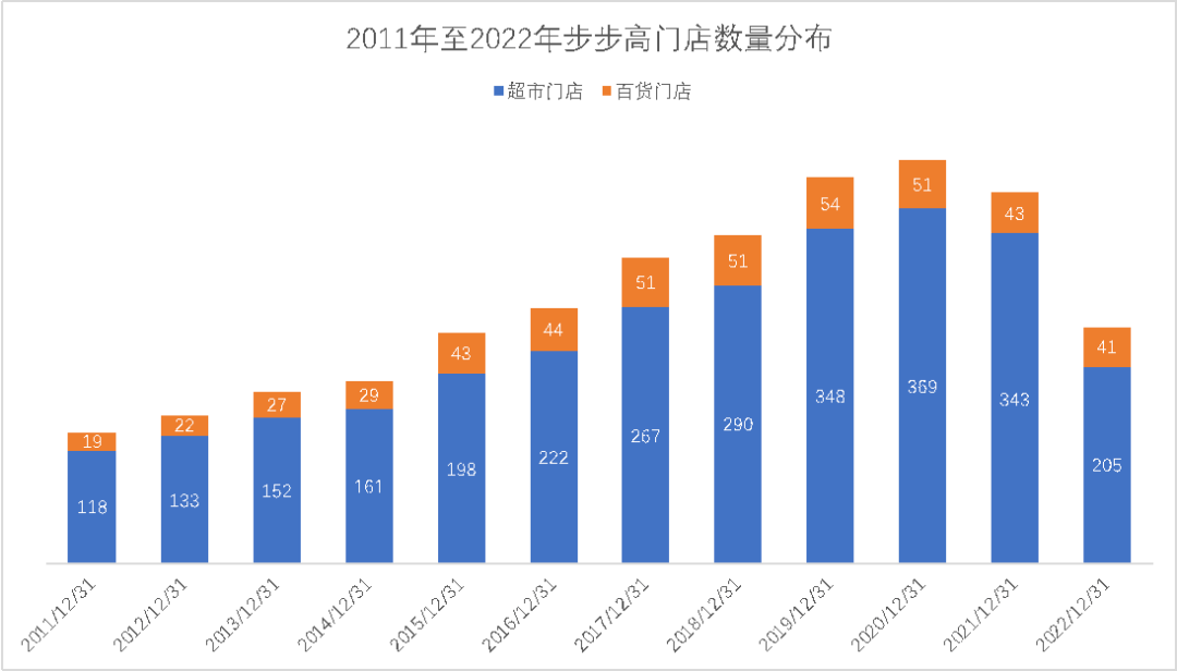 步步高2017年-2022年超市及百货业态面积 制表:乾行