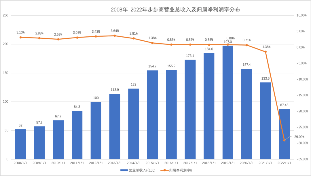 2008-2022年步步高历年营收及净利率情况 制图:乾行