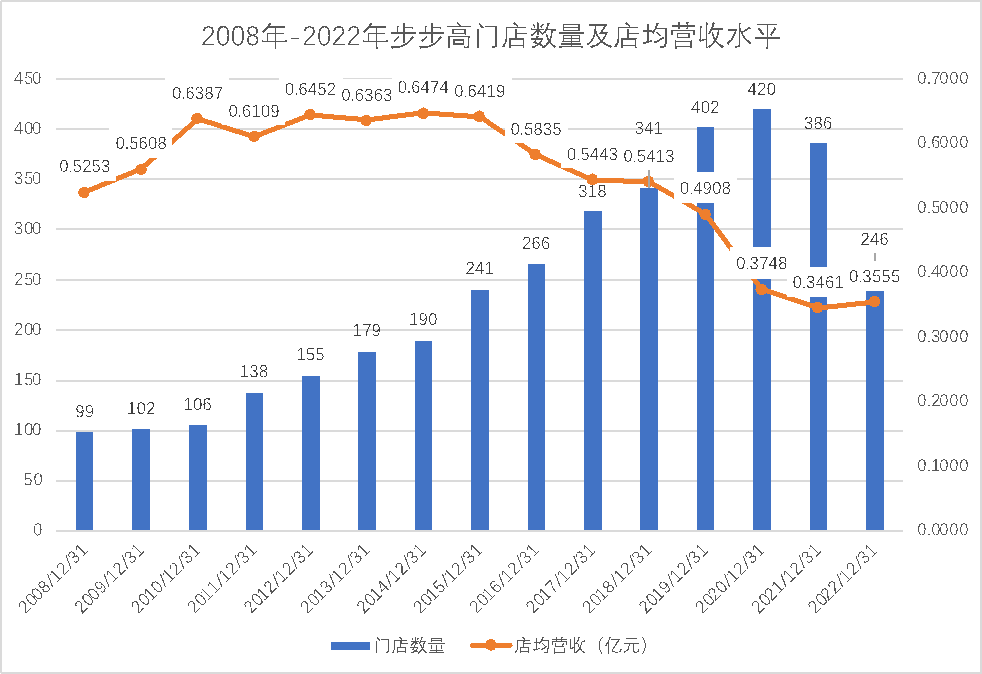 2008年-2022年步步高门店数量及店均营收水平 制图:乾行