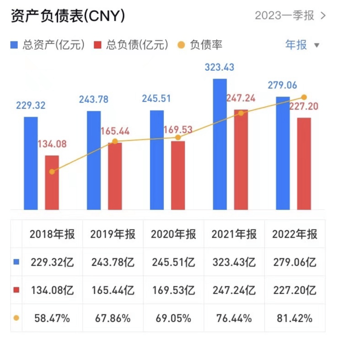 粗略统计显示,2018年-2022年上半年,步步高累计投资近68亿元用于自建房地产。但其资产增速赶不上负债的攀升速度,负债率从2018年的58%增高到2022年的81%。2022年末,步步高总资产为279.06亿元,其中约150亿元为投资性房地产,而这些资产已基本用于银行借款抵押。