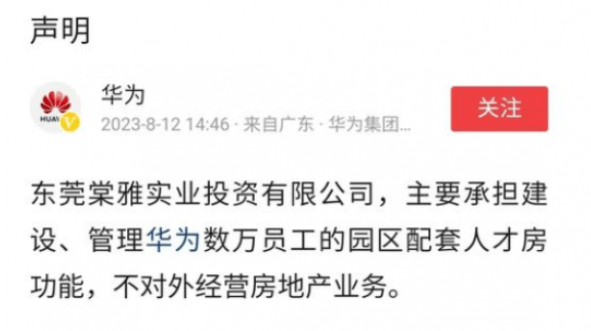 针对“华为要进军房地产”的传闻,华为12日发布声明称:东莞棠雅实业投资有限公司,主要承担建设、管理华为数万员工的园区配套人才房功能,不对外经营房地产业务,投资仍将围绕现有产业链及新技术领域进行。