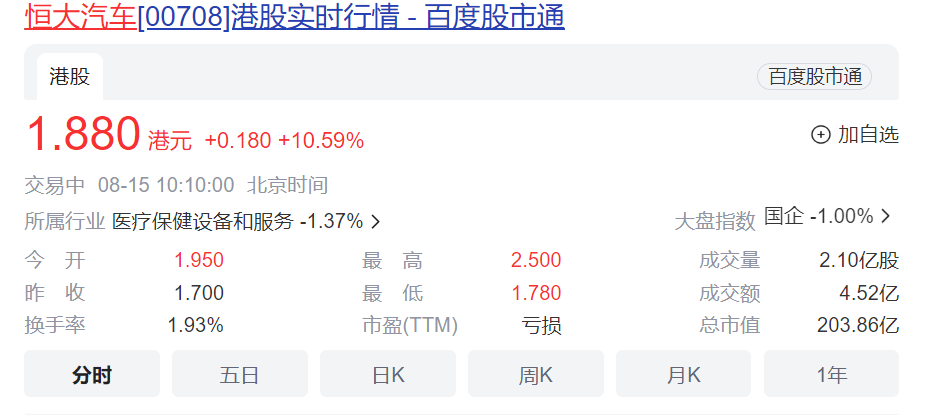 受上述消息影响,恒大汽车港股早盘快速拉升,一度大涨超45%。截至发稿前,报1.88港元,涨超10%。