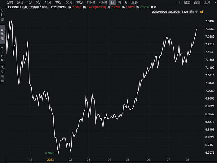 8月15日,离岸人民币兑美元跌破7.30关口,续创2022年11月以来新低,日内跌超300个基点。