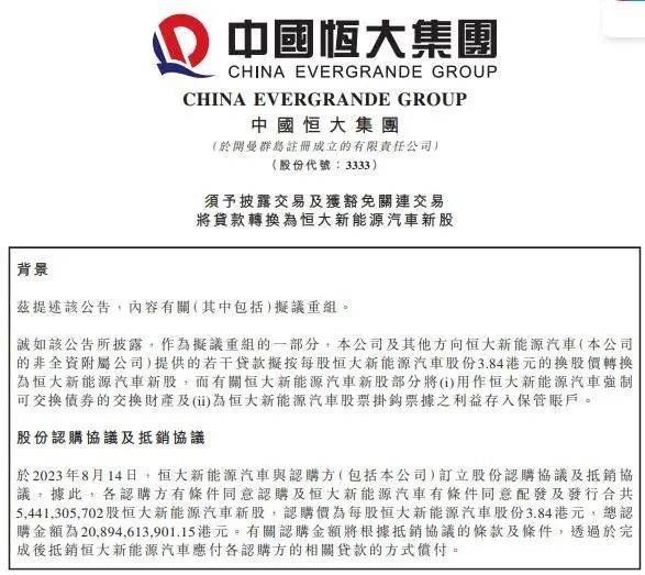 同在周一晚,恒大发布另一公告,披露将贷款转为的新股,恒大汽车有条件获得将近209亿港元认购。作为境外债务拟议重组的一部分,恒大及其他方向恒大汽车提供的若干贷款拟按每股恒大汽车股份3.84港元的换股价,转换为恒大汽车新股。