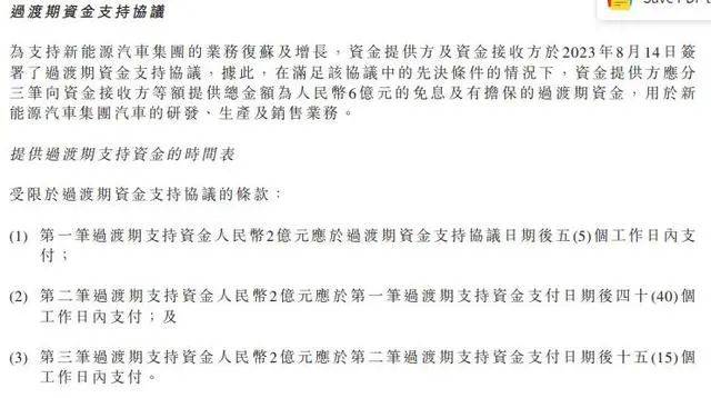此外,纽顿集团签署了过渡期资金支持协议,在满足抵押品完成登记及备案等先决条件的情况下,将分三笔,向恒大汽车提供总额6亿元人民币的免息及有担保过渡资金,用于恒大汽车的研发、生产及销售业务,将自公告后5个工作日开始陆续支付。