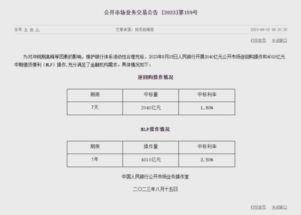 8月15日,人民银行发布消息称,为对冲税期高峰等因素的影响,维护银行体系流动性合理充裕,人民银行开展2040亿元公开市场逆回购操作和4010亿元中期借贷便利(MLF)操作,充分满足了金融机构需求。其中,MLF利率下调15个基点至2.5%;7天期逆回购利率下调10个基点至1.80%。