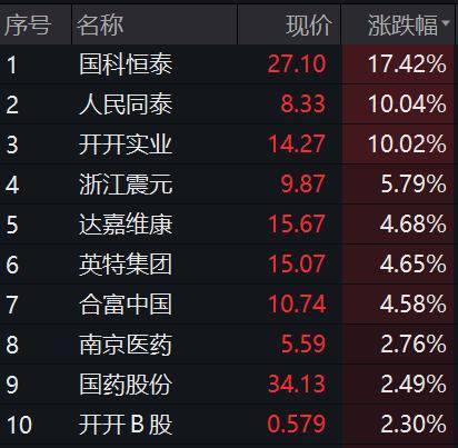 截至午间收盘,华人健康拉出20CM涨停,国科恒泰涨17.42%,人民同泰、开开实业涨停,药易购涨超10%。