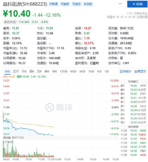 8月15日上午,光伏、半导体板块领跌。明微电子跌超13%,千亿市值的晶科能源跌超12%。