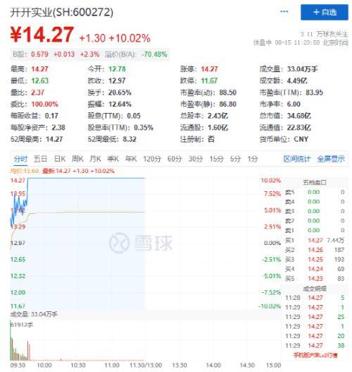 其中,开开实业开盘后迅速拉出涨停板,实现“五天四板”,最近5日涨幅达到52.13%。