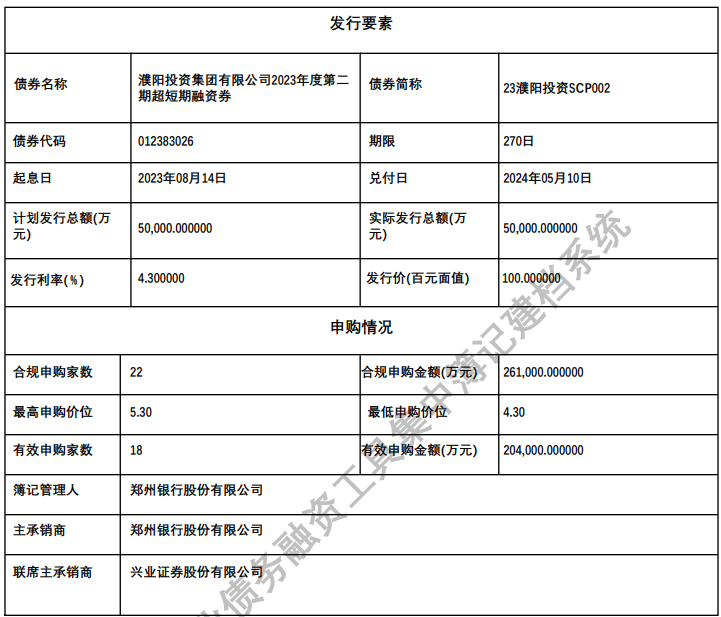 【大河财立方消息】8月15日消息,濮阳投资集团有限公司日前公布了2023年度第二期超短期融资券发行情况。