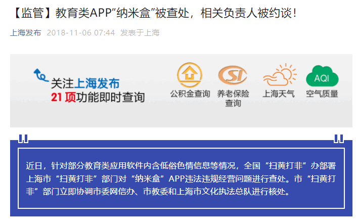 对此,上海市文化市场行政执法总队组织执法人员队“纳米盒网”及移动终端APP“纳米盒”进行了网络巡查,并约谈该APP运营者相关负责人,责令其立即整改并删除相关内容。