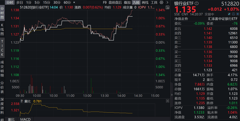 主流ETF方面,截至14:20,银行业ETF(512820)涨超1%,成交额超1600万元。