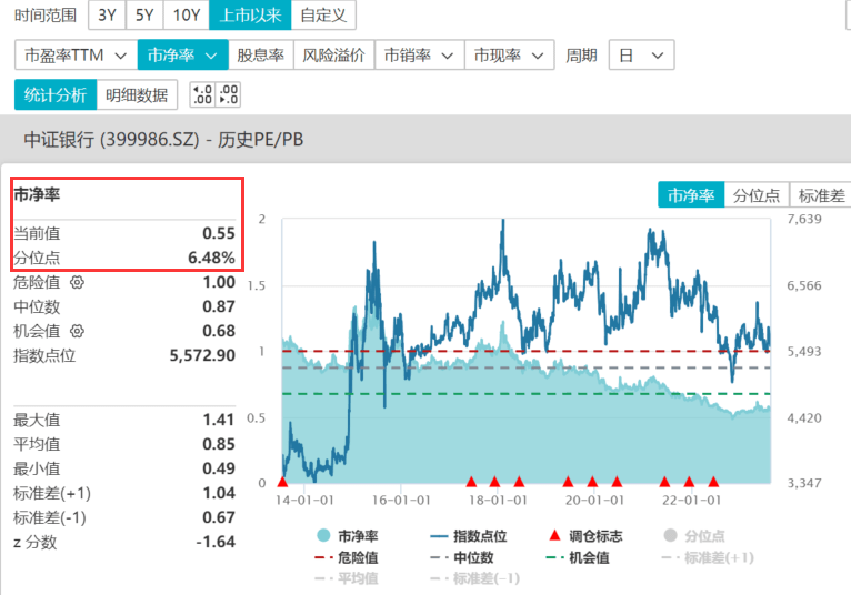 最新数据显示,截至8月14日,中证银行指数市净率为0.55倍,为指数2013年发布以来6.48%分位点,即低于近10年来93.52%的时间区间,性价比凸显。