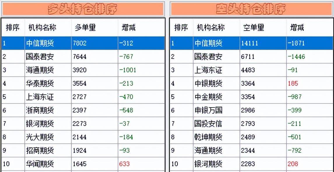 先来看下对下一个交易日有预判作用的“神器”——中信期货在股指期货上的增减持情况。它在沪深300股指期货上多单方面减仓312手,空单方面减仓1871手,给出了“偏多”的信号——预判失误。