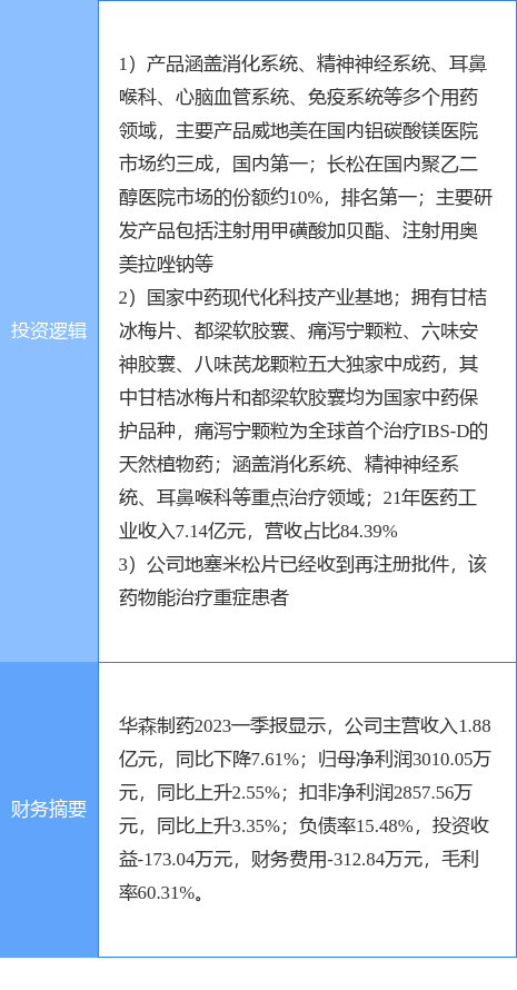 华森制药涨停收盘,收盘价19.02元。该股于9点51分涨停,未打开涨停,截止收盘封单资金为7058.09万元,占其流通市值1.23%。
