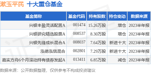 根据2023半年报公募基金重仓股数据,重仓该股的公募基金共5家,其中持有数量最多的公募基金为兴银丰盈灵活配置A。兴银丰盈灵活配置A目前规模为1.08亿元,最新净值1.9236(8月14日),较上一交易日上涨0.1%,近一年下跌1.9%。该公募基金现任基金经理为孔晓语。孔晓语在任的基金产品包括:兴银先锋成长混合A,管理时间为2019年11月18日至今,期间收益率为24.41%;兴银研究精选股票A,管理时间为2023年3月9日至今,期间收益率为0.7%。