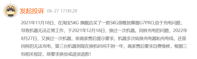 还有消费者于6月27日发起投诉称,“2021年11月18日,买了一款SKG颈椎按摩器G7PRO,由于充电问题,导致机器无法正常工作。于2021年12月18日,换过一次机器,(出现)同样的充电问题,2022年8月27日,又换过一次机器,依商家售后提示要求,机器多次换充电器和充电线,还是同样无法充电。”