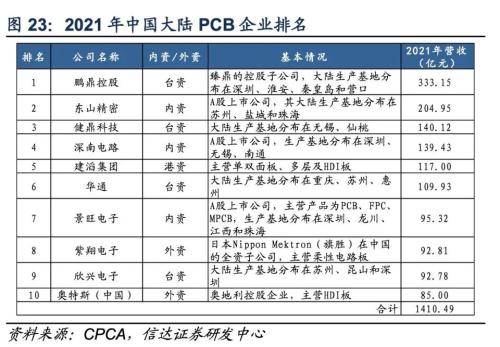 鹏鼎控股从事各类印制电路板的研发、设计、制造与销售服务。据信达证券数据统计,2021年鹏鼎控股以营收333.15亿元居于中国大陆PCB龙头,其后分别是东山精密(002384.SZ)、健鼎科技、深南电路(002916.SZ)。