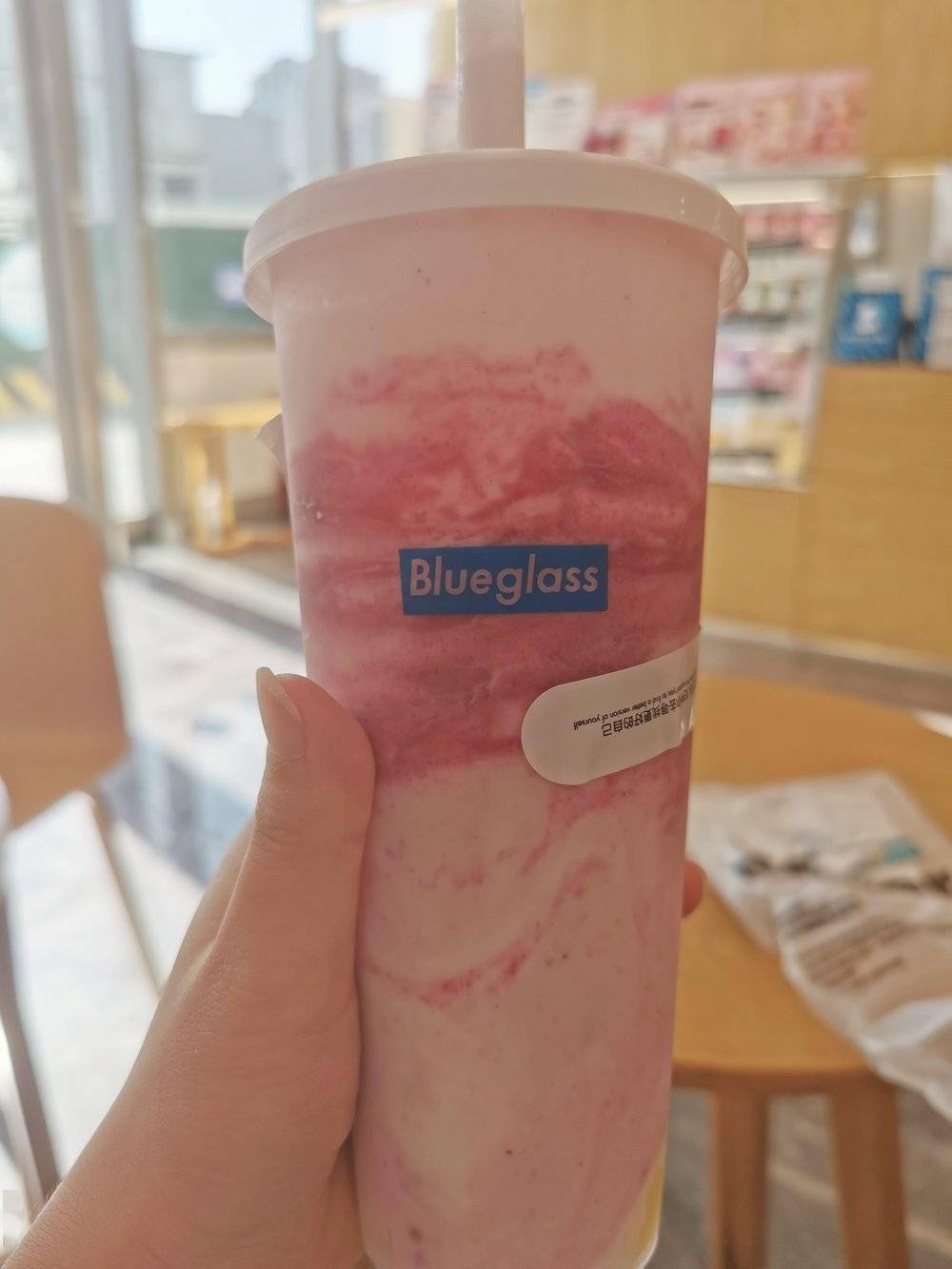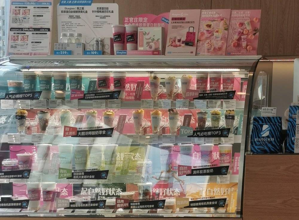 北京东三环附近的一家Blueglass(现制酸奶品牌)门店,店员拿起一个磨砂质感的塑料杯子,先在杯壁上轻轻抹上一层酸奶,然后撒上粉色的紫薯粉,氤氲的色彩立马让普普通通的塑料杯梦幻了起来。把杯子打扮好后,底层放入爆珠、水果泥等,再根据客户点单,加入相应配料,一杯售价45元的酸奶就做好了。