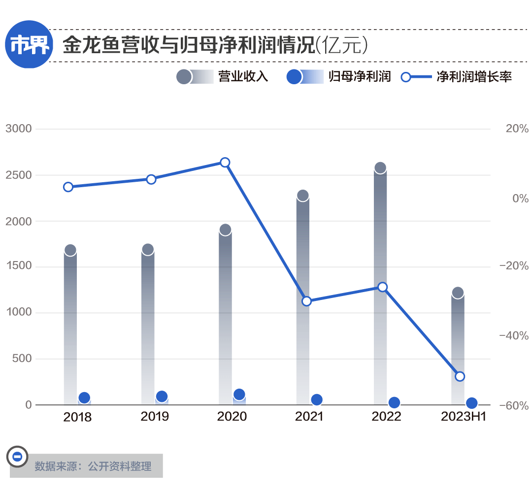 2023年上半年,金龙鱼实现营业收入1187.14亿元,同比下降0.64%;归母净利润为9.66亿元,同比下降51.13%;扣非净利润为0.14亿元,同比大降99.40%。