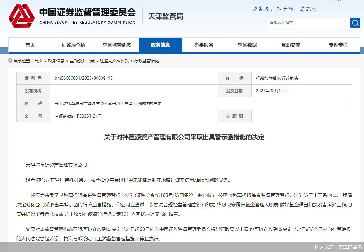 原标题:因管理私募基金未谨慎勤勉 天津祎童源资产管理遭监管出具警示函