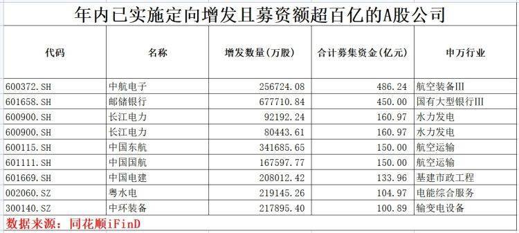 数据还显示,年内已实施定向增发的公司中,定增募资额超100亿元的有8家,50亿元~100亿元的有14家。其中,中航电子是定增募资额最高的A股公司,定增25.67亿股、合计募资486.24亿元;邮储银行定增67.77亿股,合计募资450亿元;长江电力实施了两次定增,合计定增17.26亿股,募资额共计321.94亿元;中国东航、中国国航、中国电建、粤水电与中环装备定增募资额超百亿元。定增募资额不足10亿元的有126家,其中楚天科技、皓元医药、天安新材、普联软件等7家公司募资不足1亿元。