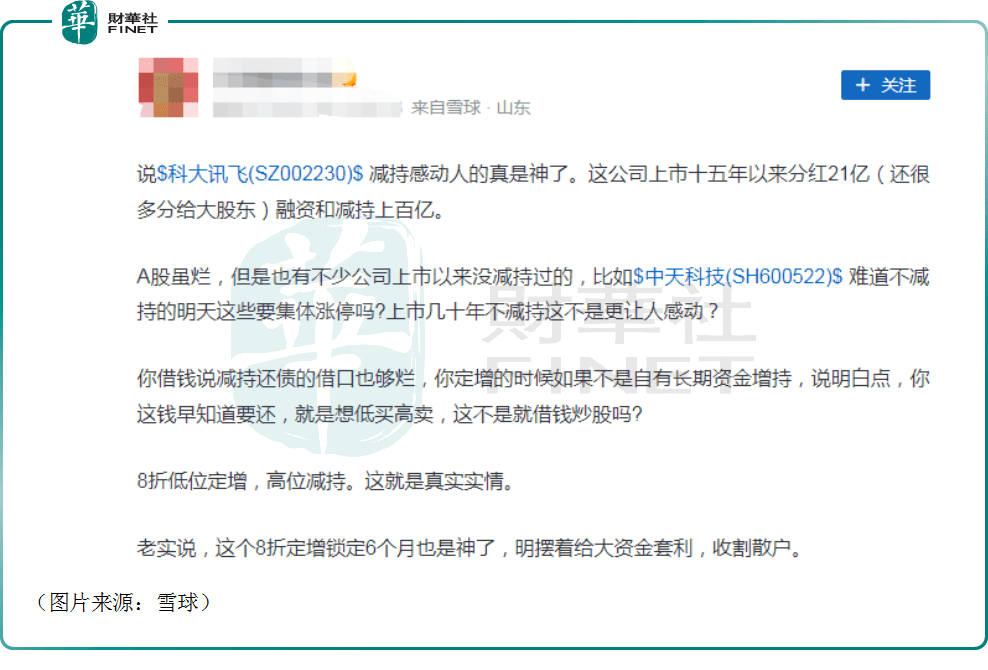 该投资者称,科大讯飞上市15年以来分红21亿元,但融资和减持了上百亿。