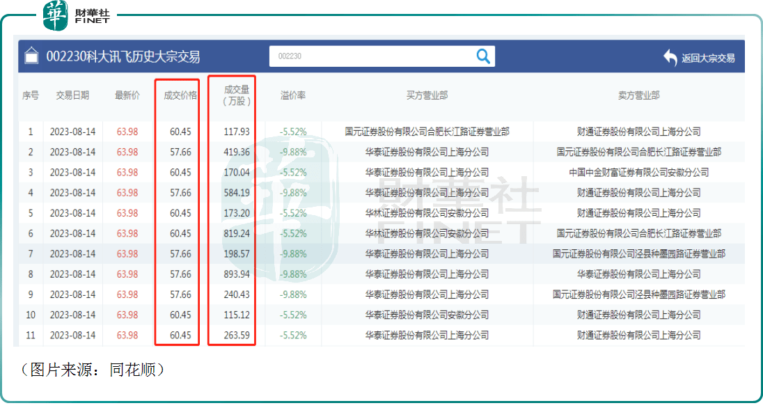 同花顺数据显示,8月14日,科大讯飞发生了11笔大宗交易,合计成交3995.61万股,合计成交金额为23.5亿元,成交均价约为58.82元/股。