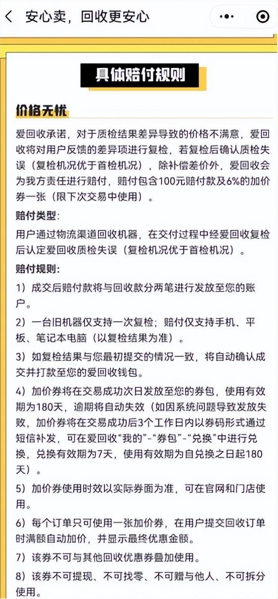 不过,野马财经发现,在爱回收小程序上明确标明了具体赔付的规则。规则显示,对于质检结果差异导致的价格不满意,爱回收将对用户反馈的差异项进行复检,若复检后确认质检失误,除补偿差价外,爱回收会为其责任进行赔付,赔付包含 100 元赔付款及 6%的加价券一张。