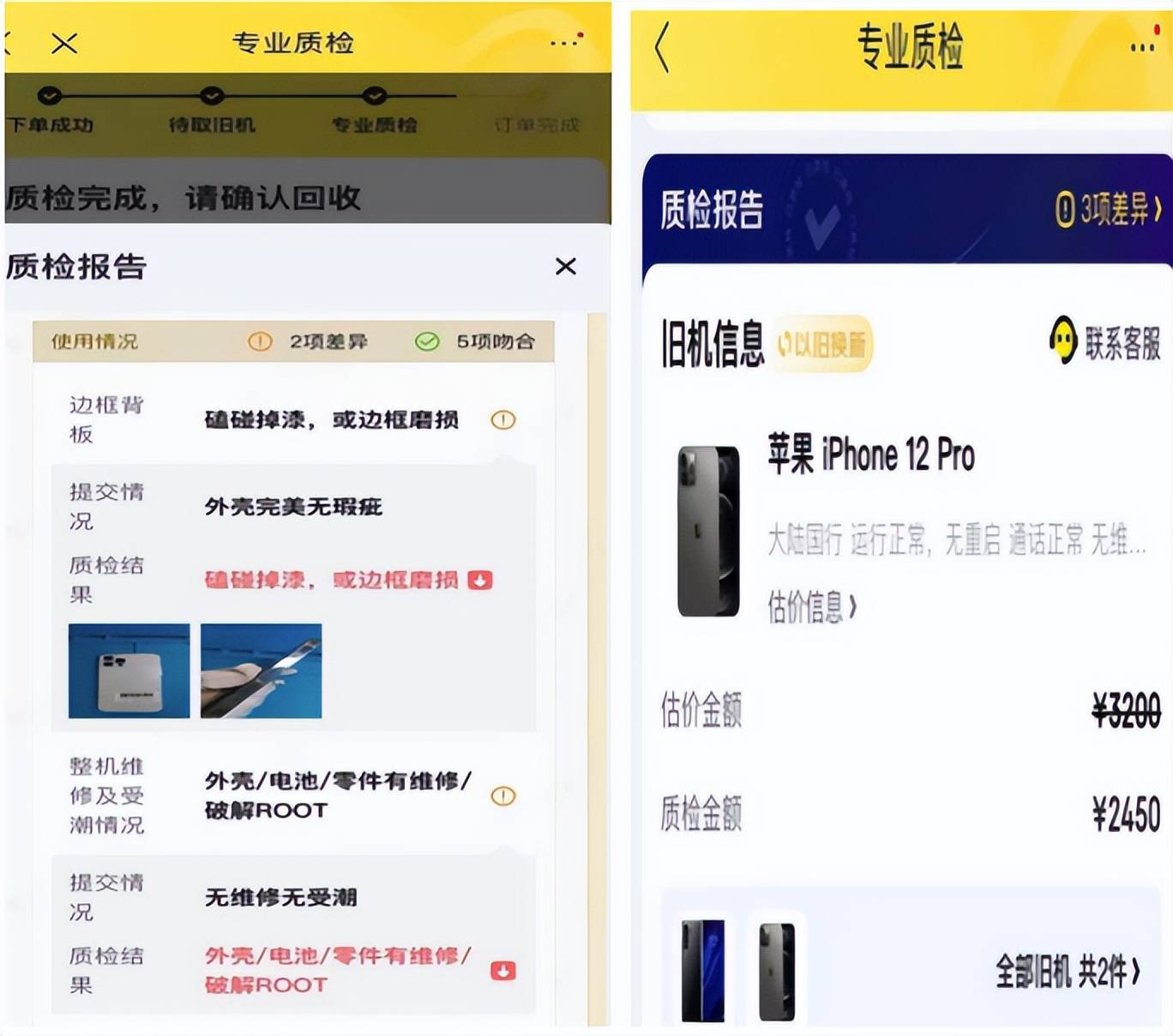 无独有偶,在黑猫投诉上,三十岁的北京海淀市民李先生表示,自己在爱回收出售一台苹果 iphone 12 pro,平台给出的估价是3200 元,但质检过程中却以“手机存在维修记录、轻微使用痕迹”为由,估价降至 2450 元。而李先生坚持表示自己的手机从未维修过。