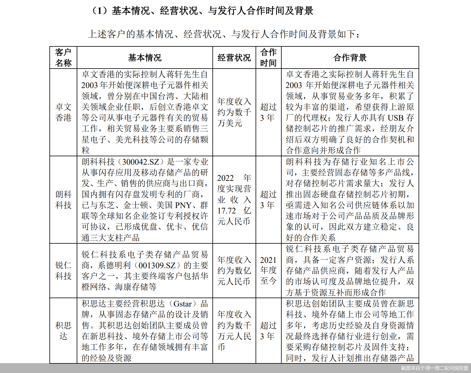 在得一微的大客户中,积思达、绵存(浙江)科技有限公司(以下简称“绵存科技”)等均是刚一成立就与公司开展合作。其中积思达于2018年成立,于2019年成为得一微主要客户;JTG、绵存科技分别成立于2020年、2021年,均是在成立当年就成为得一微的主要客户。