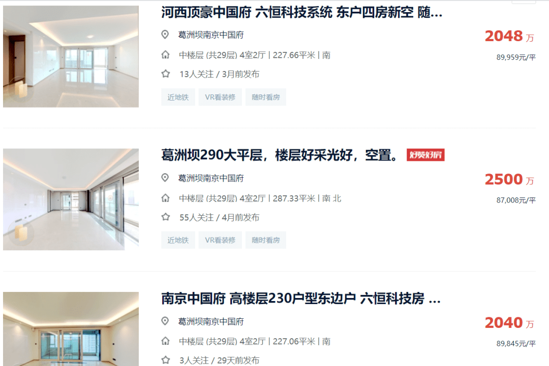 此前,河西青奥滨江板块的老牌高端改善盘长江尊邸(中国府),作为南京高端住宅市场的知名项目,如今二手房市场挂牌加都是2000万起步,更是在今年上半年售出过最高总价超过3000万的房源。