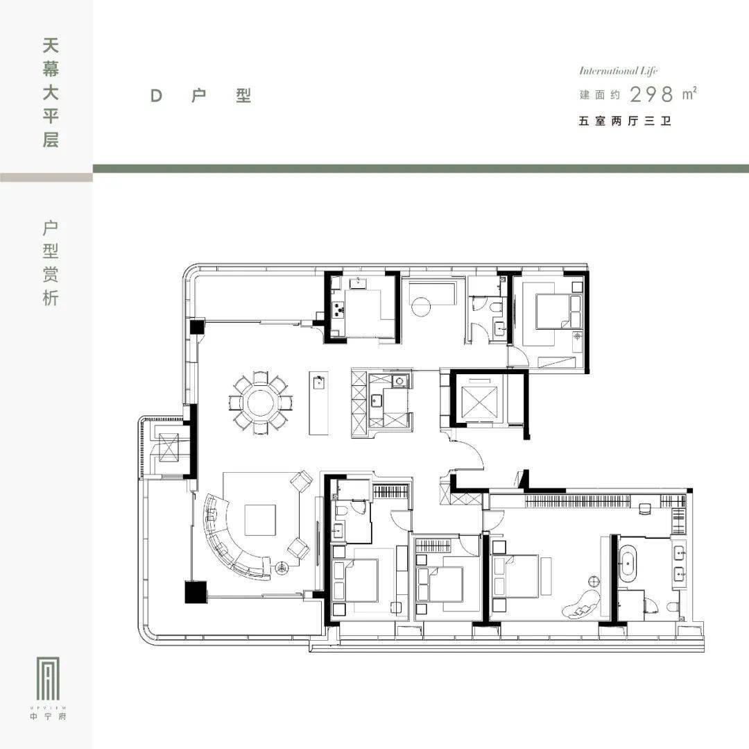 建面约298㎡户型,五房两厅三卫布局,所有功能区都以玄关为中心有序排布,动线互不干扰,动静分区效果拉满。南北双阳台配置,南北通透,LDKB一体化设计,整个联通的空间约70㎡,加上约3.3米层高,270°全景落地窗,在满足日常家庭互动交流所需空间之外,更收获一份绝佳的全视角景观。