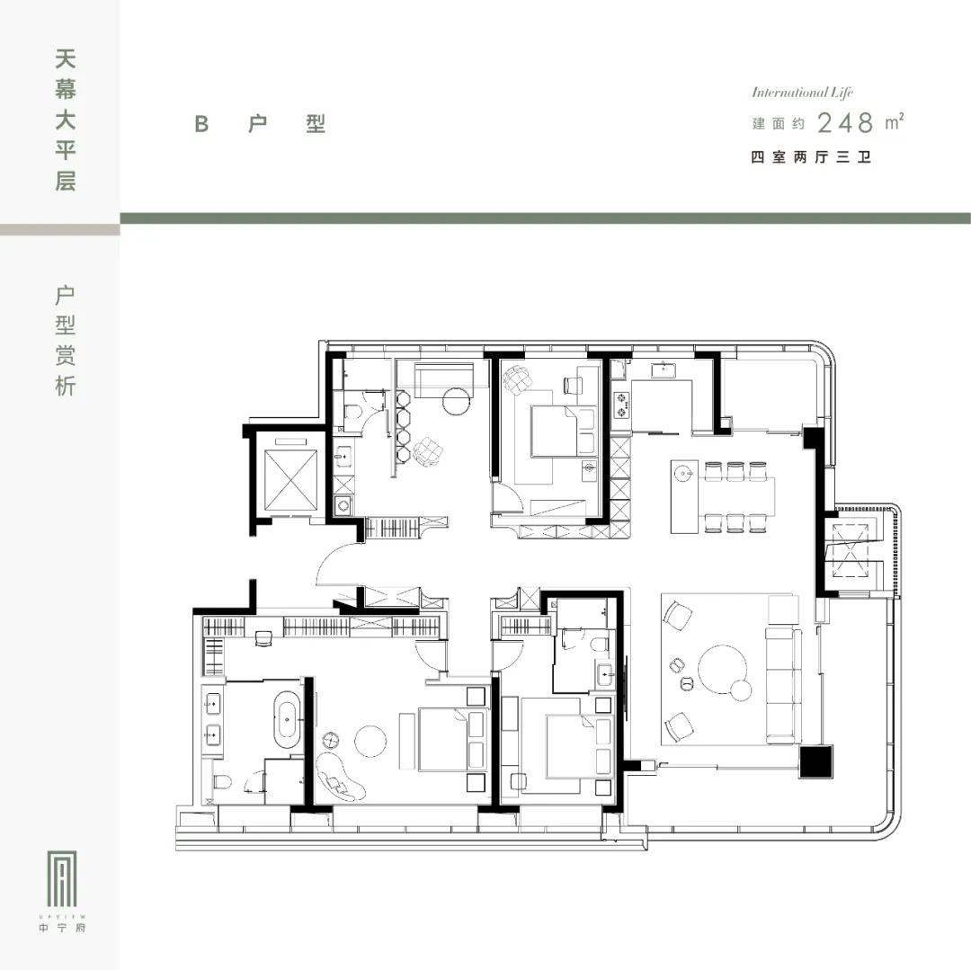 建面约248㎡户型,四室两厅三卫布局,一梯一户设计,双入户玄关,南向“双套房+端厅”拉开近21米南向面宽,尤其是端厅外连270°转角大阳台,开间近8米、进深约2米,实现采光面和观景面的延伸。另外还配有北向阳台,整个空间更透彻明亮。