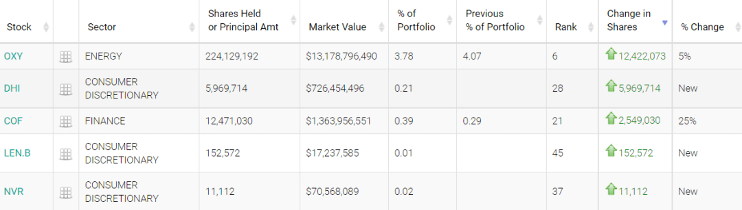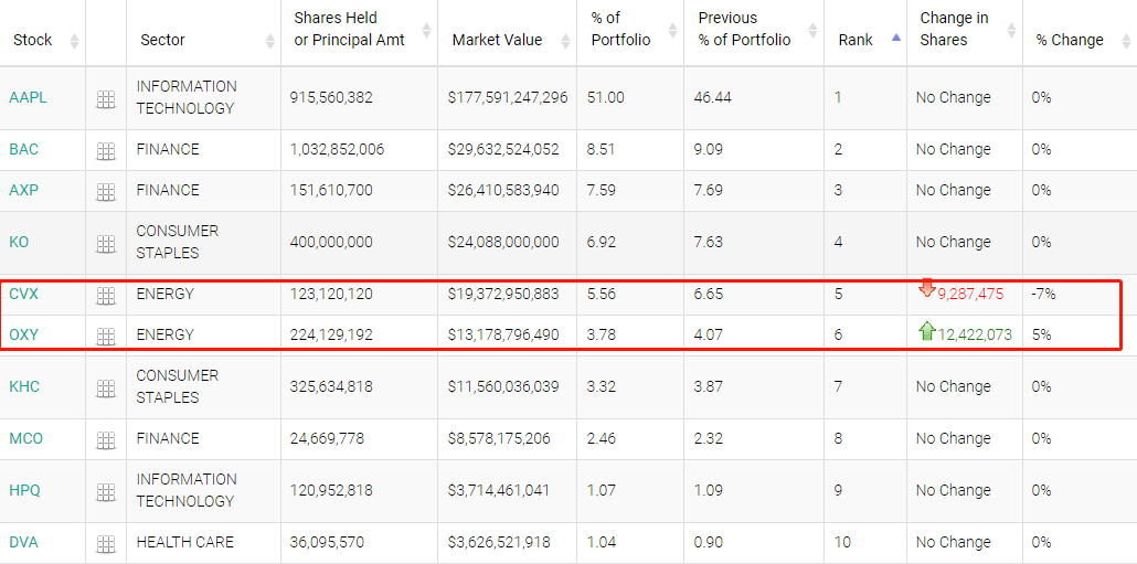 前十大持仓中,增持了1242万股西方石油股份,加仓幅度为5%,持仓价值为131.78亿美元。减持了929万股雪佛龙,减持幅度为7%,持仓价值为193.72亿美元。