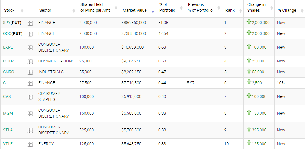 前十大持仓中,持有200万份看空SPY标普500 ETF看跌期权,持有200万份看空QQQ纳斯达克100 ETF看跌期权。