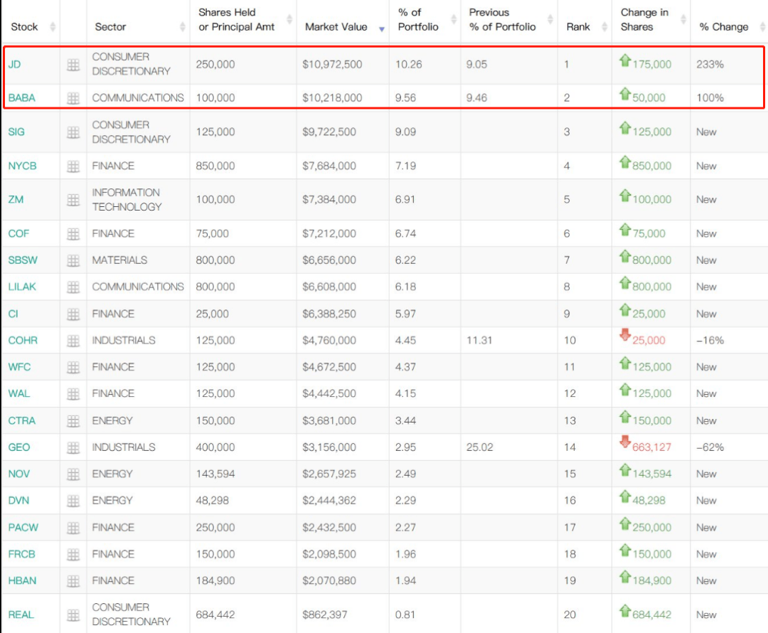 以翻两倍的金额加仓京东,持股价值为1097万美元,成为第一大重仓股。而翻倍的金额加仓阿里,持股价值为1021万美元,成为第二大重仓股。