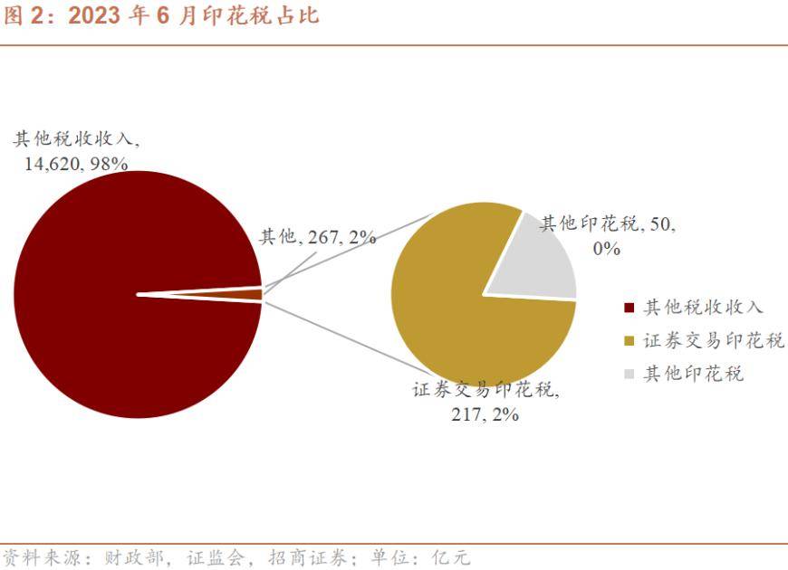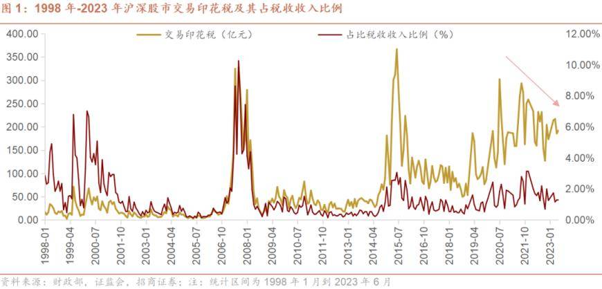 自1998年以来,证券交易印花税曾于2007年及2015年达两次小高峰,占国家财政税收收入较大比重。据证监会及财政部数据统计,2007年8月证券交易印花税为327.92亿元,占财政税收收入的10.25%;2015年6月证券交易印花税为366.61亿元,占财政税收收入的3.06%。自2020年起,证券交易印花税占比呈不断下降趋势。